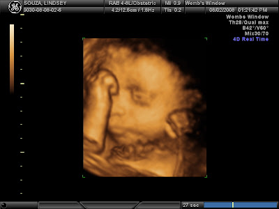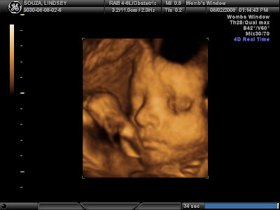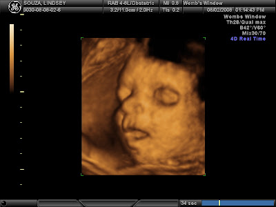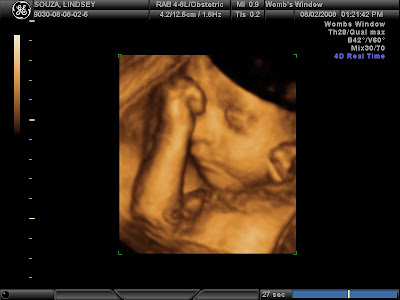 He was asleep when she started the scan but only took a moment to wake right up. And begin poking and jabbing and kicking at the pressure of the ultrasound wand thing. After about 30-35 minutes of being in perfect position for pictures and us seeing his face, he promptly rolled over to face my back then she REALLY had to work to get shots of him, including asking me to eat candy (Travis got a piece too). He was set on being stubborn though and wouldn't flip back over so after about 10 minutes of seeing what we could like he was, we called it a day. It was only supposed to be 30 minutes so I had no complaints. He kept his hands up around his face. Sometimes over it, sometimes just in front of it. Occasionally a foot would pop up there also. As you'll see in the pictures, he would OPEN HIS EYES some too. Travis really liked that. All in all, we were all amazed and it was worth every cent to do it. I wanted to put some of the dvd on here, but ummm, video conversion isn't my strong point and I've already got 1 email asking where are the pictures, so I'm just going to put them up here for now! Here are my favorites: