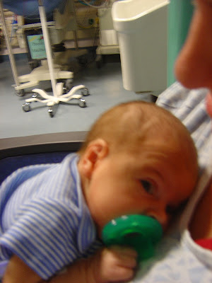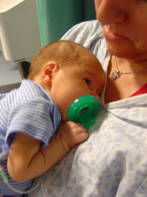 Well, I imagine the poor resident assigned to Riley today doesn't care for me much. I mean I like her, but I asked to speak to the attending earlier in the day when she said the plan was to leave the replogle in till the weekend....and then, when she decided he was breathing too fast to feed by mouth, and putting a feeding tube in defeated the purpose....she was overruled by the same attending (not by my doings this time). He came around on afternoon rounds and asked how Riley handled the pedialyte. Ummm he didn't get pedialyte as Dr so and so says he's breathing too fast. OVERRULED. It was as if Riley knew what had just been said and he went from sleeping peacefully in my arms to being in a rooting/hunger frenzy. That pedialyte couldn't get there fast enough. It was only 8mL's of pedialyte (there are 30mL's in an ounce), so it's a really pitiful amount. But...testing both his stomach ability and his ability to know how to suck/swallow/breathe all at once without choking or aspirating the food into his lungs. Since he's 3 weeks old now and has never had to put this skill to use, I was nervous.